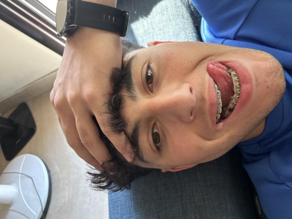 A young male individual, appearing to be in his late teens or early twenties, is depicted in a close-up, selfie-style photograph taken indoors within Sarouja Municipality, Syria. He possesses dark, short, curly hair and brown eyes, with a light-to-medium skin tone. The subject is wearing dental braces on both his upper and lower teeth, visible as his mouth is open and his tongue is extended outwards, touching his upper palate. His right hand is positioned on his head, with fingers resting on his hair. A dark-colored smartwatch with a round face and a black silicone band is worn on his left wrist. He is dressed in a blue short-sleeved top. The background indicates an indoor setting with a light-colored surface, and parts of a white object (possibly a fan base) and a black stand are visible in the upper sections of the frame. The individual appears to be reclining on a blue fabric surface. Natural light illuminates the scene from the right.