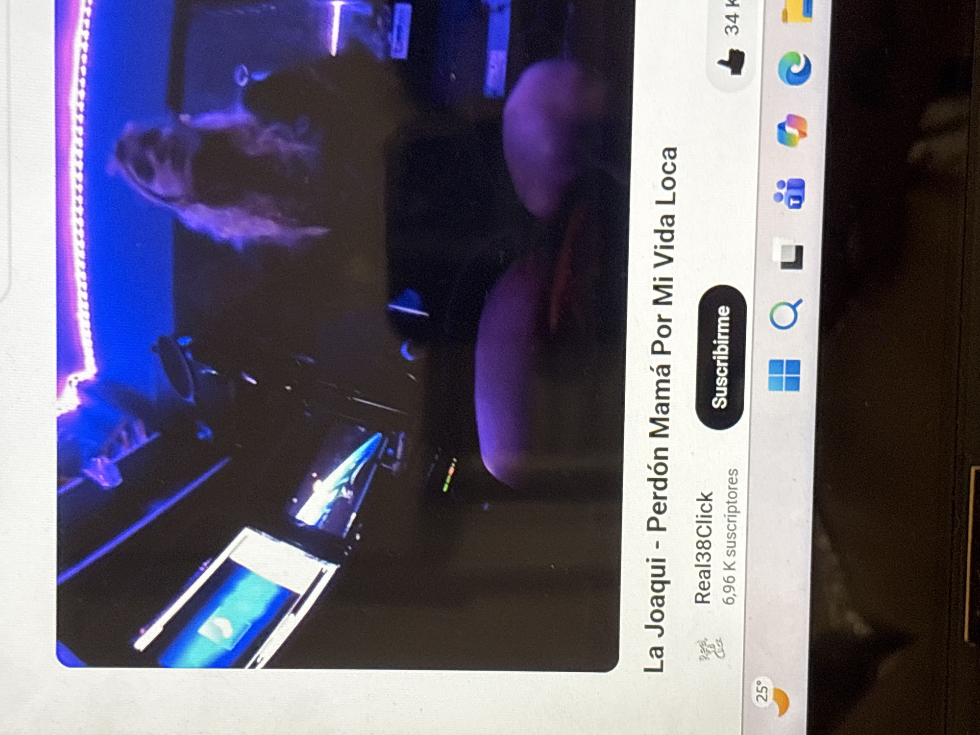 Here is a description of the image: The image shows a laptop screen displaying a YouTube video by "La Joaqui" titled "Perdón Mamá Por Mi Vida Loca" (Forgive Me Mom for My Crazy Life). The video thumbnail features a person with long hair and dark lighting, with some neon lighting in the background. The channel "Real38Click" has 6.96K subscribers. A "Subscribe" button is visible. On the right side of the screen, there is a thumbs-up icon with "34k" next to it. The laptop also shows weather information indicating a temperature of 25 degrees.