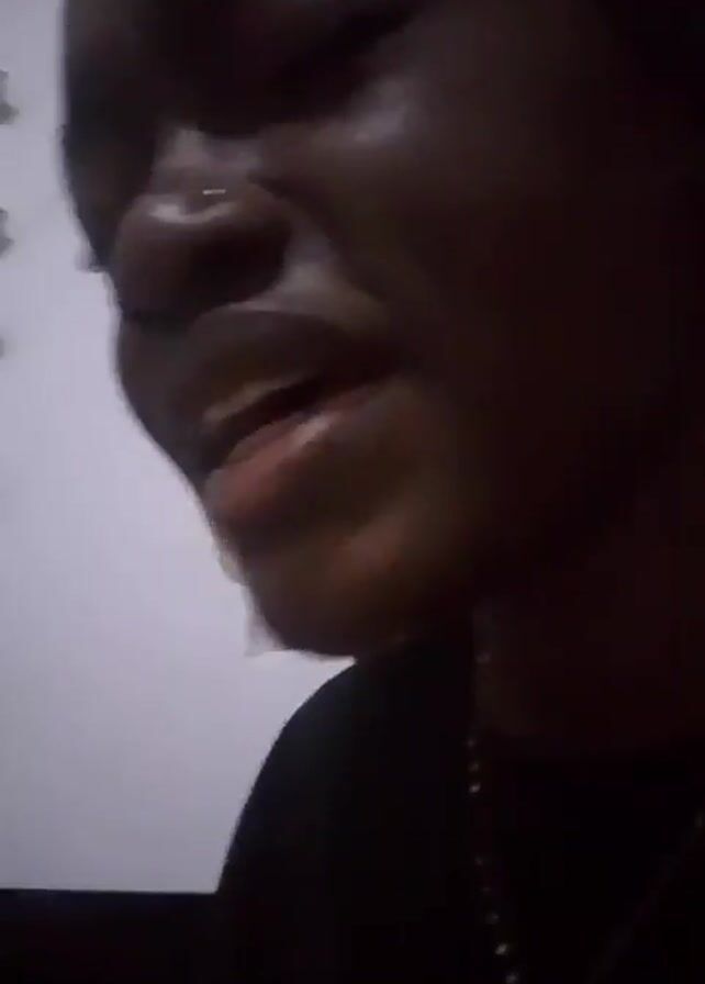 A close-up shot of a dark-skinned person wearing a black shirt and a necklace. They appear to be singing, with their mouth open and facial expressions conveying emotion. A curtain is visible in the background on the right. There is also a leafy decoration on the wall.