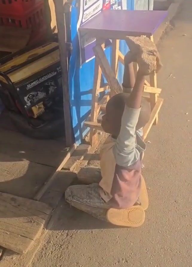 A young, slender, Black boy sits on the ground near a roadside market stand. He wears a light gray long-sleeved shirt, a dark pink or red vest, and light blue jeans. His feet are covered with light tan sandals. He holds a large chunk of brown object, potentially bread or earth, with both hands above his head as if exercising. The market stand has a blue and white sign that reads, "CASH DEPOSIT," "CASH WITHDRAWAL," "FUND TRANSFER," and "BILL PAYMENT." The table is supported by a simple wooden structure. Beside the stand, a red rack filled with Coca-Cola bottles and a SUMEC FIRMAN generator are visible. The ground is dry and dusty.