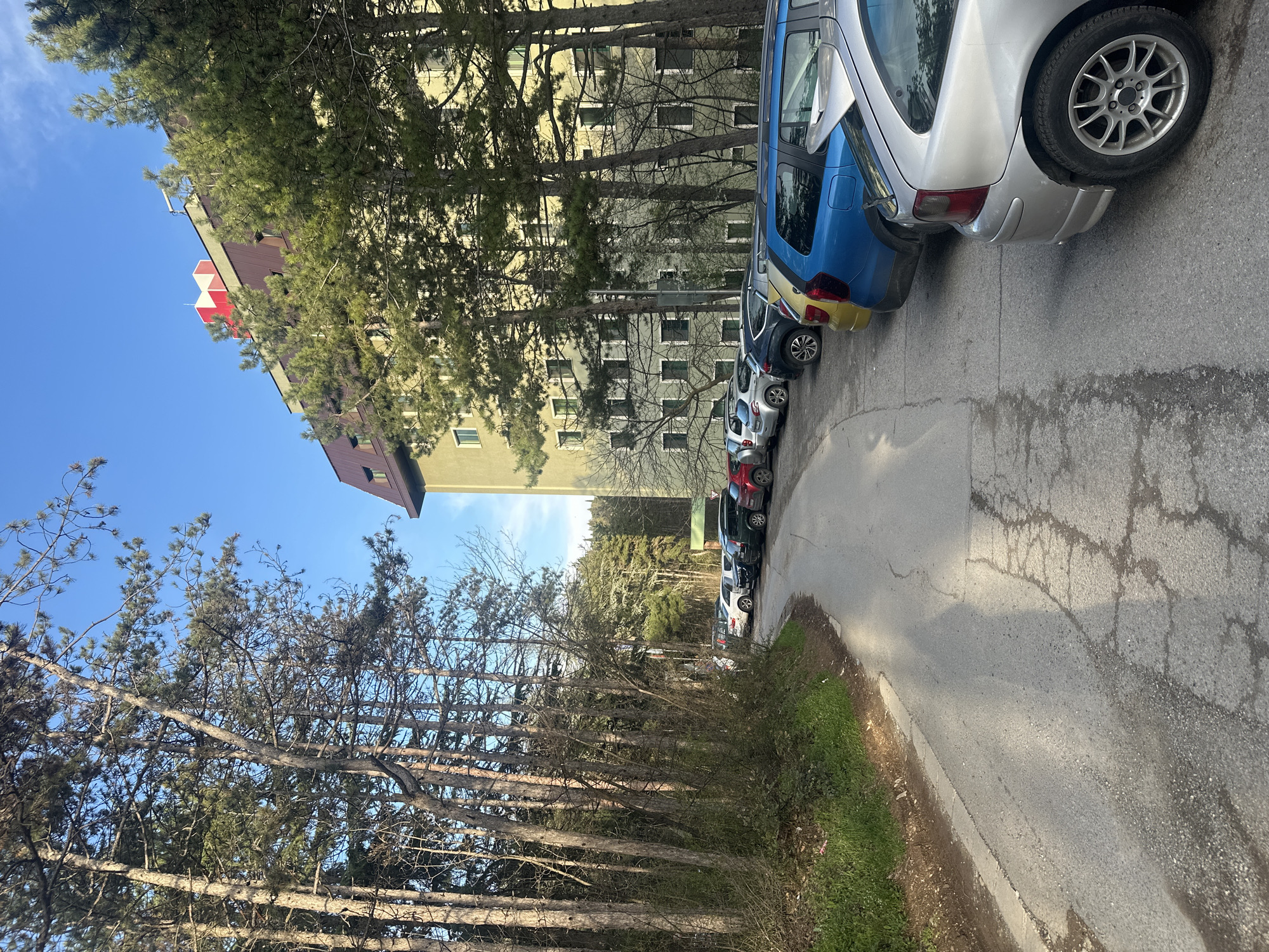 row of parked cars along a street in Unknown, Unknown. The cars are lined up on the right side of the frame. In the background, there is a building with several windows. On the left side of the image, there are trees. The sky is visible in the upper part of the frame.