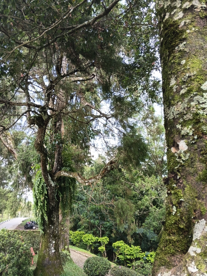 The scene is located at Bangalum Bridge, Papua New Guinea. The foreground features two prominent tree trunks. The trunk on the right is thick and vertical, heavily textured with patches of green moss and white lichen. The trunk on the left is gnarled, covered in moss, and supports a dense growth of green ferns along its length, with its branches extending throughout the upper-center. Above, a dense canopy of various tree branches and green foliage partially obscures a bright, diffused sky. In the mid-ground, a paved road with a distinct white edge line curves from the upper-left towards the lower-left. A dark-colored all-terrain vehicle (ATV), showing two wheels and rear storage components, is parked on the grassy verge of this road, partially obscured by the left foreground tree. Below the road and to the right of the left tree, a winding dirt path extends through a manicured area containing several neatly trimmed green bushes. The background consists of a dense, natural forest or jungle with multiple layers of green foliage. No individuals are present, and no active interactions or specific actions are depicted within the frame.