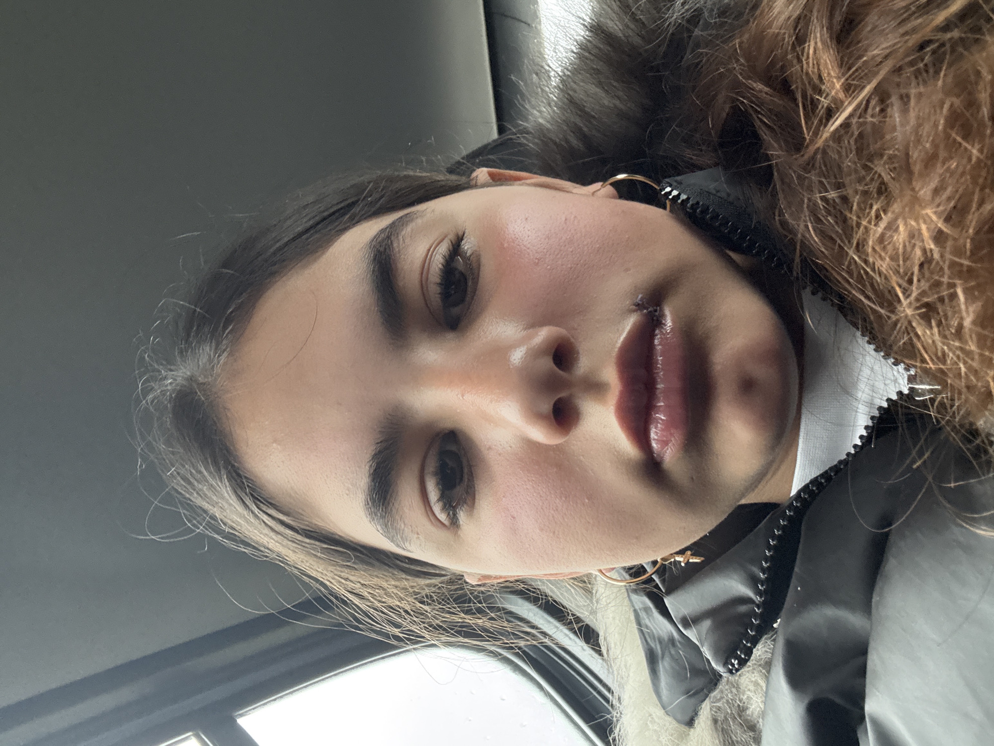 A young woman with brown hair and eyes looks upward at the camera. There are sutures on her upper lip. She wears hoop earrings. She appears to be in a car; the corner of a window is visible. The woman wears a jacket with a zipper. The location is not evident from the image.