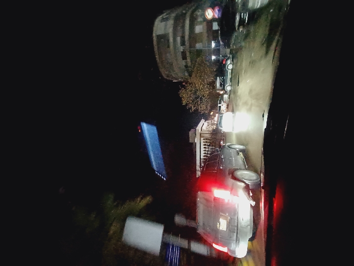 A nighttime scene captures a street lined with parked cars and buildings. The perspective is tilted, revealing a row of vehicles with illuminated headlights and taillights. A tall building stands in the distance, reflecting a blue light. Streetlights illuminate the scene, casting shadows on the road and nearby vegetation. The overall atmosphere is dark, with only the lights providing visibility.