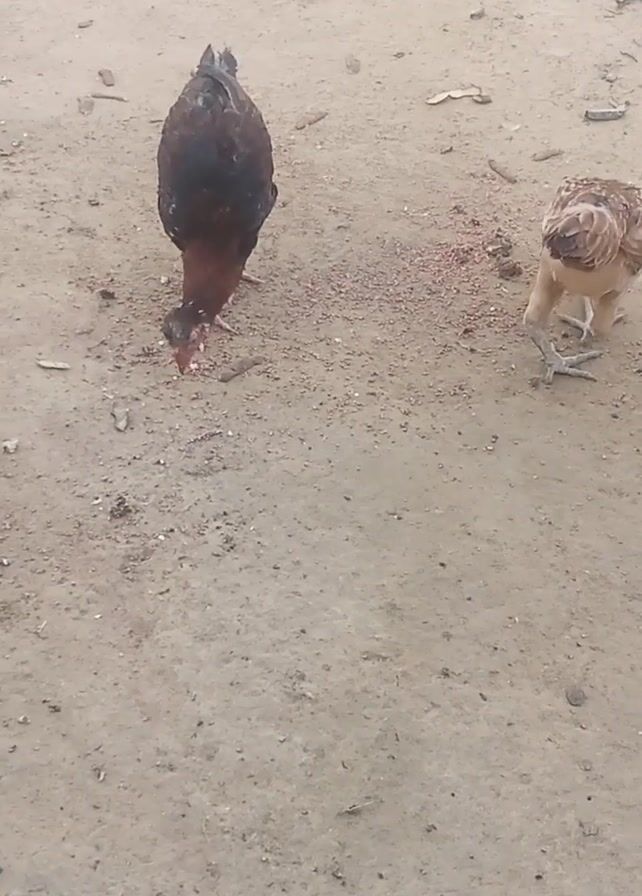 Two chickens are pecking at grains scattered on a dusty ground. One chicken is lighter brown with feathered legs, while the other is darker brown and black. The camera is positioned overhead, capturing the scene from above with a wide angle.