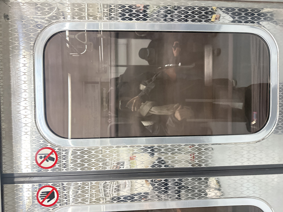 A silver, reflective train door features two warning signs prohibiting leaning and touching. A rectangular window reveals the interior, reflecting a person wearing a hat, possibly holding a phone, and various interior elements like handrails. The door's surface exhibits a textured, crisscross pattern adding visual detail.