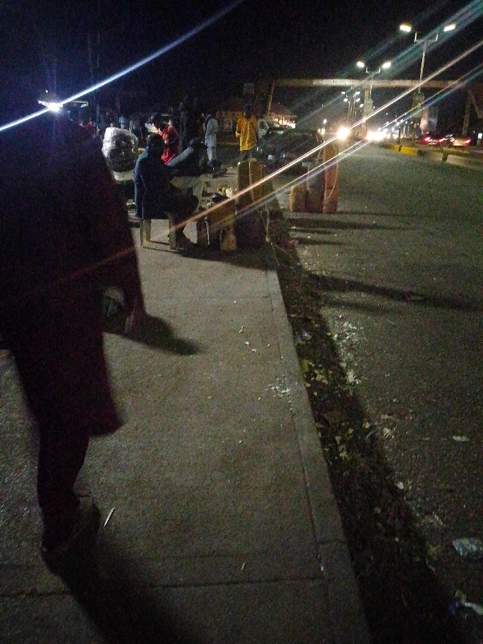 At night, a street scene unfolds. People are gathered on a sidewalk near a street. One person is seated on a chair. The environment appears urban, with streetlights casting long shadows. Car lights gleam in the distance, suggesting passing traffic. Litter and debris are scattered along the curb.