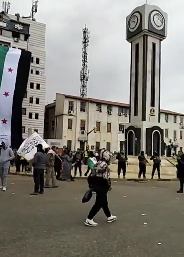 A street scene shows a crowd of people, many holding or wearing the Algerian flag. The setting seems to be in a town square near a clock tower, under a cloudy sky. Most of the people appear to be walking around, some are gathered in small groups. There are buildings visible behind the crowd, including a tall building with communication towers on top. The general impression is of a public gathering, potentially a political demonstration or celebration.
