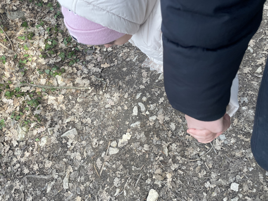The image displays a high-angle view of two individuals interacting in a natural, unpaved outdoor environment, typical of a forest floor or woodland path in or near Targovishte, Bulgaria. The ground is composed of dark soil, numerous dry, light brown deciduous leaves, scattered small to medium-sized light-colored rocks, and thin twigs. Patches of green ivy are visible among the leaves, predominantly in the upper right quadrant. In the foreground, the lower left arm and hand of one individual (Subject A) are visible, along with a portion of their upper left thigh. Subject A wears a black, padded winter jacket sleeve and dark-colored lower garments. Their left hand is clasping the right hand of a second individual (Subject B). Subject B is positioned to the right, showing their head, right shoulder, and upper torso. Subject B wears a light pink ribbed knit beanie and a light-colored (off-white or cream) padded winter jacket. Subject B's head is oriented to the left, with their gaze directed downwards towards the ground or Subject A. The interaction suggests Subject A is guiding or accompanying Subject B. The specific location within Targovishte, Bulgaria, is a generic wooded area, lacking distinct landmarks for precise identification beyond a natural outdoor setting.