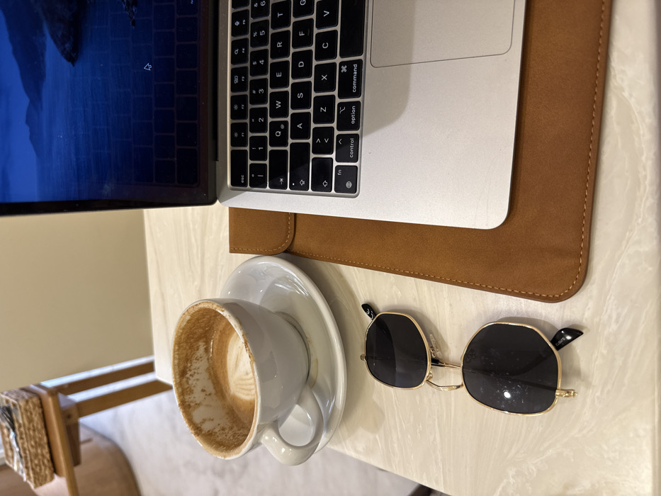 This image captures a close-up, static scene on a light-colored, patterned table surface in the city of Paris, France. In the left foreground, a white ceramic coffee cup with a handle sits on a matching saucer; the cup contains a small amount of dark liquid with residual latte art and frothy residue along its interior rim, indicating partial consumption. Directly in front of the coffee cup, a pair of black-lensed, gold-framed square sunglasses is folded and resting on the table. To the right of these items, an open silver-toned laptop is positioned atop a rectangular brown leather or suede mat with visible stitching. The laptop screen displays a dark blue desktop background featuring a mountainous coastal landscape and a white mouse pointer. The visible keyboard has a standard English (QWERTY) layout. In the blurred background, a light wooden stand or small table with a woven basket containing cutlery is partially visible against a plain light wall. No individuals are present in the frame.