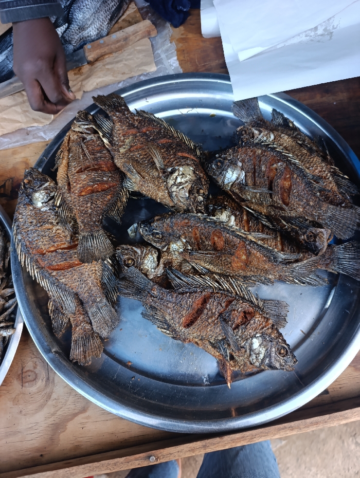 - "A silver platter holds multiple whole fried fish, arranged overlapping each other" by FM-BGGAG2, licensed under CC BY 4.0
