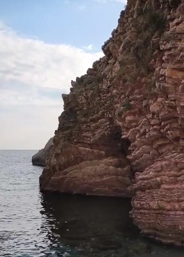 rocky cliff jutting into the ocean. The cliff is composed of layered rock formations. The water near the cliff is clear enough to see some of the rocks below the surface. The sky is visible in the background and is a mix of blue and white clouds.