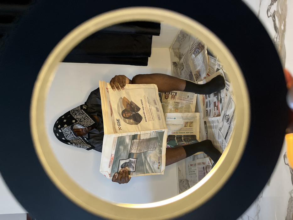 Within the city of Joma, Ghana, a dark-skinned individual is depicted seated, observed through a circular frame with a black outer ring and a golden inner circumference. The person wears a dark, possibly grey, collared shirt and a black bandana with a white paisley pattern covering their head and obscuring the upper portion of their face. Their bare legs are visible from above the knees, and they are wearing black socks on both feet. The individual is holding a large, open newspaper, covering their lower torso and lap. Visible content on the newspaper includes the acronym "GSE," text reading "REFRESHED AND AHEAD," images of two distinct individuals, and a QR code associated with the University of Ghana. Additional sheets of newspaper are scattered across the white tiled floor, which features grey veining. The background consists of a plain white wall directly behind the seated person and a dark, possibly black, curtain or fabric hanging on the right side of the scene.