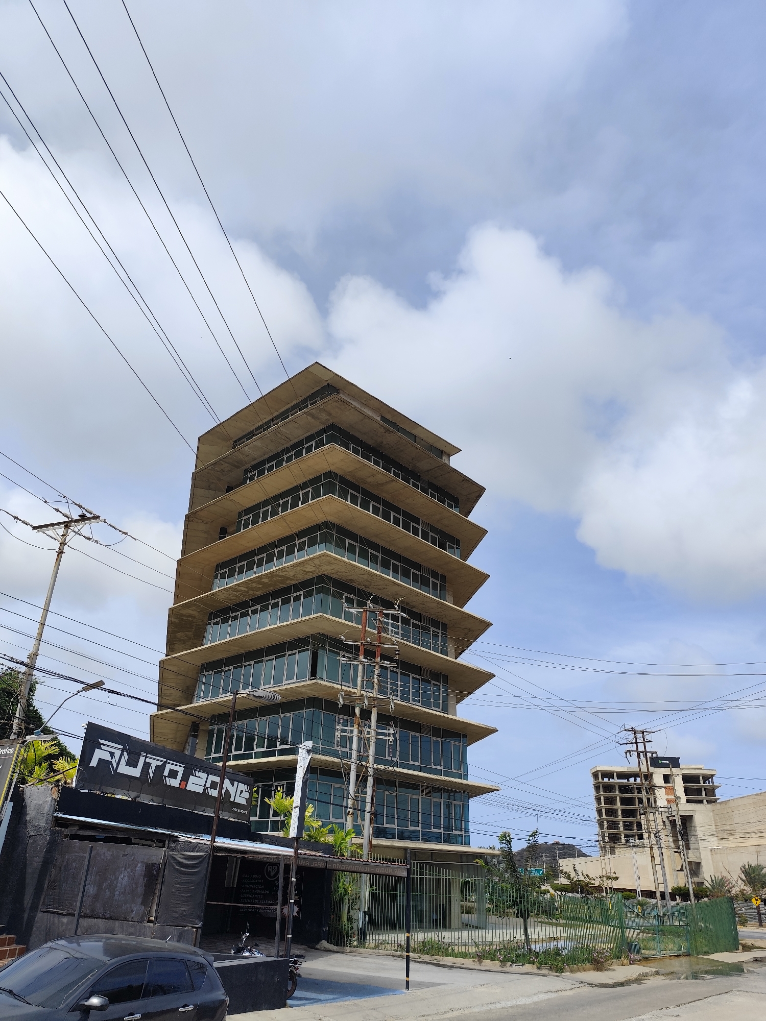 multi-story building in Los Robles, Venezuela. The building has a unique architectural design with overhanging concrete slabs on each floor. The facade is predominantly glass windows. The building appears modern but unfinished or slightly weathered. In the foreground, there is an "Auto Zone" store, characterized by its dark facade and signage. A dark-colored car is parked in front of the store. Power lines crisscross the sky above, adding to the urban feel. Across the street from the modern building, is another building that is currently under construction. The sky is light blue with scattered white clouds. The overall scene depicts an urban environment, a mix of established business, ongoing construction, and weathered infrastructure.