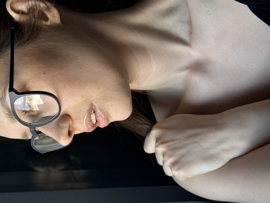 A close-up, left-profile photographic depiction of an adult female subject, observed indoors in the city of Chaikovsky, Russia. The subject wears dark-framed, circular eyeglasses, in which reflections of external architectural structures and a bright sky are visible. Her lips are slightly parted, displaying the upper dentition, and possess a distinct glossy sheen. Her hair, of a dark hue, is drawn back from her face; her left hand is positioned on her left shoulder, gripping a segment of her hair. The left shoulder, clavicle region, and upper chest are exposed, indicating minimal upper body attire, with a dark garment partially visible at the lower right edge of the frame. The immediate background is uniformly dark and lacks discernible features.