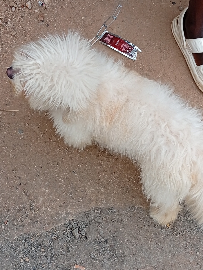 A small, white, long-haired dog is observed lying on its belly, facing left, on an unpaved outdoor surface. Its white fur is disheveled, with some reddish-brown staining visible on its back. The dog's tongue is partially extended from its mouth. Adjacent to the dog's head, a silver-colored metal chain, possibly a leash or collar, rests on the ground next to a crumpled red and silver foil sachet. In the upper right quadrant, a dark-skinned human foot, wearing a white open-toed slide sandal, is partially visible. The ground is composed of light brown dirt mixed with various sizes of dark gravel and small stones. No specific visual elements within the image definitively confirm the location as Jos, Nigeria.