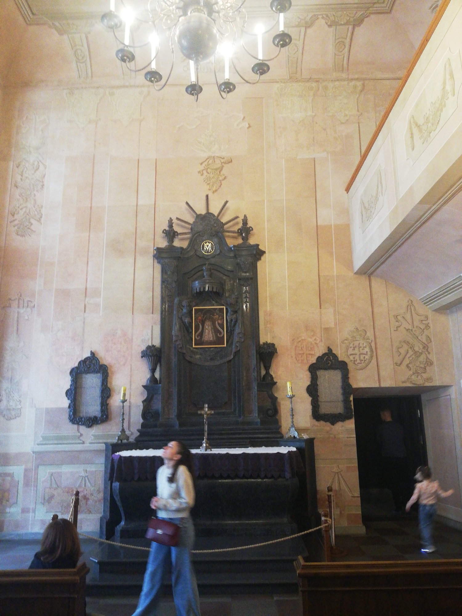 The image depicts the interior of the Farny Church of Corpus Christi, located within the Nesvizh Castle complex in Nyasvizh, Belarus. The scene captures a high-ceilinged room with light-toned, possibly stuccoed or painted walls featuring various carved relief decorations, including heraldic crests and architectural motifs. Centrally positioned against the far wall is a large, dark, ornate wooden altar or reredos. It features a prominent golden "M" monogram surmounted by a crown at the top, radiating points suggestive of a sunburst, and a framed painting depicting a Madonna and Child at its center. Below the painting, a simple crucifix is visible on a dark altar table, draped with dark fabric. Two tall, dark candlesticks with unlit yellow candles flank the altar. To the left and right of the main altar piece, lower on the wall, are two dark, ornate rectangular frames, possibly for mirrors or informational plaques. The room is illuminated by a large, ornate metal chandelier with multiple electric candle lights hanging from the high ceiling. In the foreground, dark wooden pews are visible, with the back of a seated individual's head and shoulders visible on the far left. A light-colored rope barrier separates the foreground seating area from the altar steps. Three individuals are present and actively moving. A woman in the mid-ground, wearing a light-colored long-sleeved top and blue wide-leg pants, carries a dark red handbag and is walking from right to left, her head tilted upwards as if observing the ceiling or upper wall. To the right of the altar, a dark doorway reveals a blurred adult figure partially visible within. A small child, wearing a light-colored top and jeans, is walking or running from right to left in the mid-ground, away from the doorway and towards the center of the room. A bluish glow is discernible around the child's feet, suggesting illuminated footwear. The floor in the active area appears to be dark, possibly tiled.