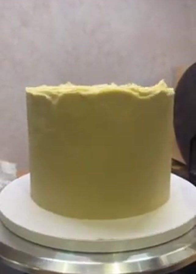 A cylindrical cake covered with light yellow frosting sits on a white turntable. The turntable is placed on a black surface. A metal spatula, also coated with the same yellow frosting, is held next to the cake. The spatula is used to smooth the frosting on the cake, and the turntable is rotated. The background is a beige wall with a speckled texture.