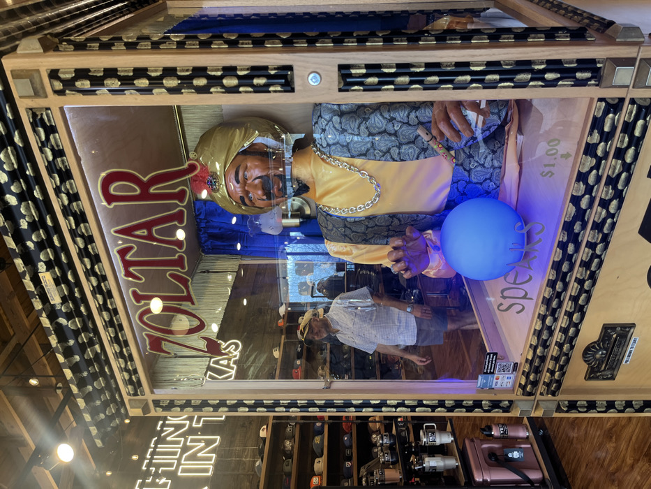 A vintage Zoltar fortune teller machine stands inside a shop, featuring a turbaned animatronic figure with a glowing blue orb in its hand