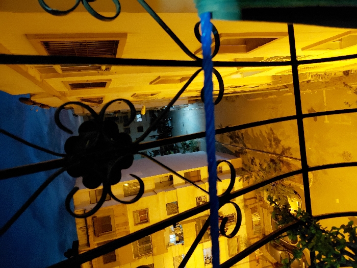 From a low angle, the image captures a view through a wrought iron balcony. A blue rope hangs down from above, partially obscuring the scene. In the background, several buildings are visible, illuminated with a warm yellow light. The sky, visible on the left, is a dark blue. Trees and street lights suggest an urban setting at night. The wrought iron details add a decorative element to the composition.