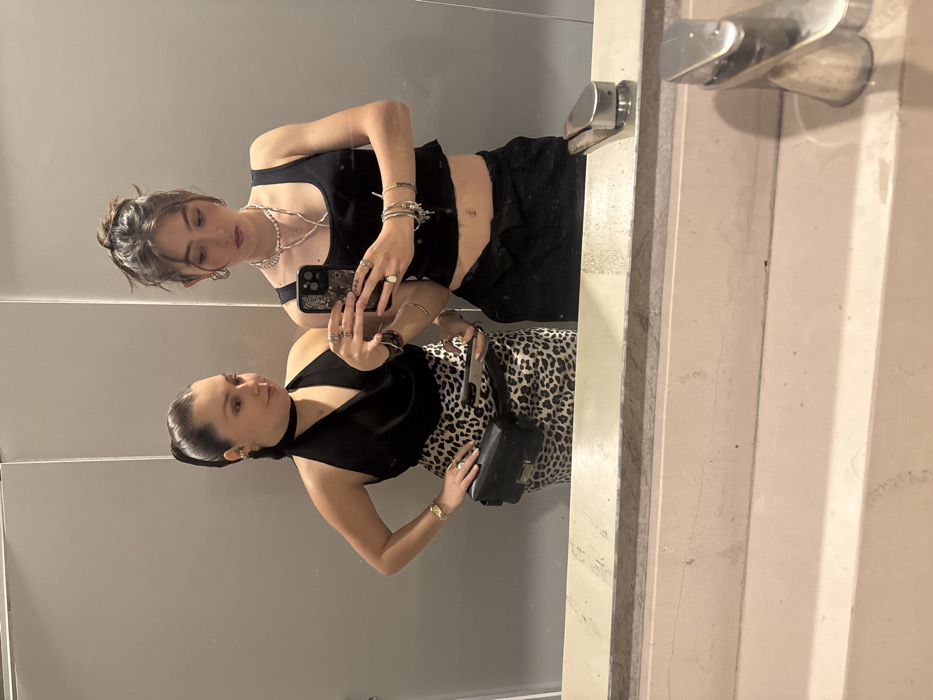Two women pose in front of a bathroom mirror. One wears a black tank top and black pants with visible abdomen. Her reflection shows another strand of jewelry. The other wears a black top with a diagonal cut across her chest and a leopard print skirt, complemented by a black handbag. Both hold phones, presumably taking the picture. A faucet juts out from the side of the mirror.