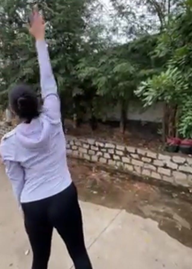 A woman stands with her back to the camera, wearing black leggings and a light grey hoodie, and grey slippers. She is on a grey paved surface with a low stone wall and trees behind her. She raises her arms and gestures as she speaks in Russian. The camera pans with her as she turns to face the street. The street is wet and there are power lines overhead. There are a few buildings visible in the distance.