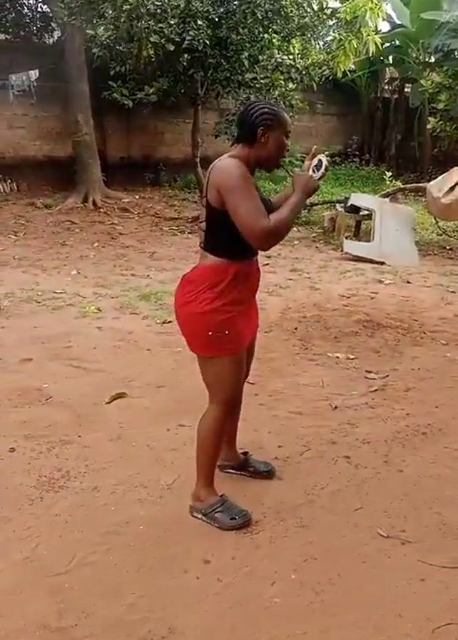 A woman is standing in a yard looking at her phone. The woman has braided hair and is wearing a black tank top and a red skirt. She has on grey slip-on shoes. The yard has red dirt and there are trees in the background. In the background there is a cinder block and what looks like a damaged metal shelf.