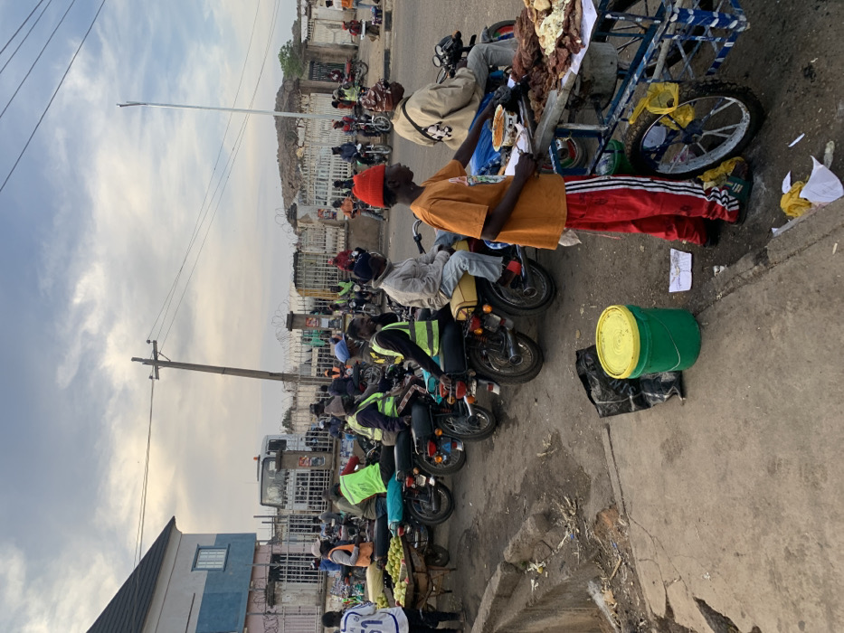 Motorcycles line a dusty street, their riders waiting. One man in red pants and an orange shirt stands near a bicycle cart laden with food. Another man is seated beside it. Most motorcyclists wear reflective vests. Buildings with barbed wire fences line the background, and a few people walk on the far side of the street. A green bucket sits beside the first motorcycle. Overhead are utility poles and a sky with scattered clouds.