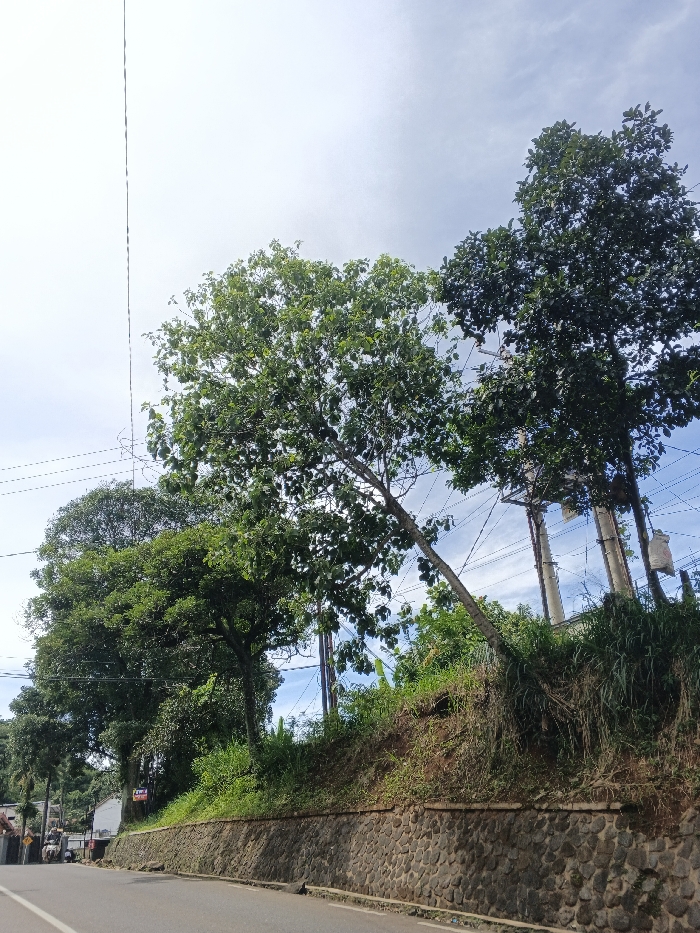 A row of lush green trees lines a road, perched atop an elevated bank stabilized by a stone retaining wall. Utility poles with wires crisscross the sky, visible between the trees. Dense green foliage covers the hillside behind the wall, contributing to a vibrant natural scene under a bright sky with scattered clouds. The road curves gently into the distance.