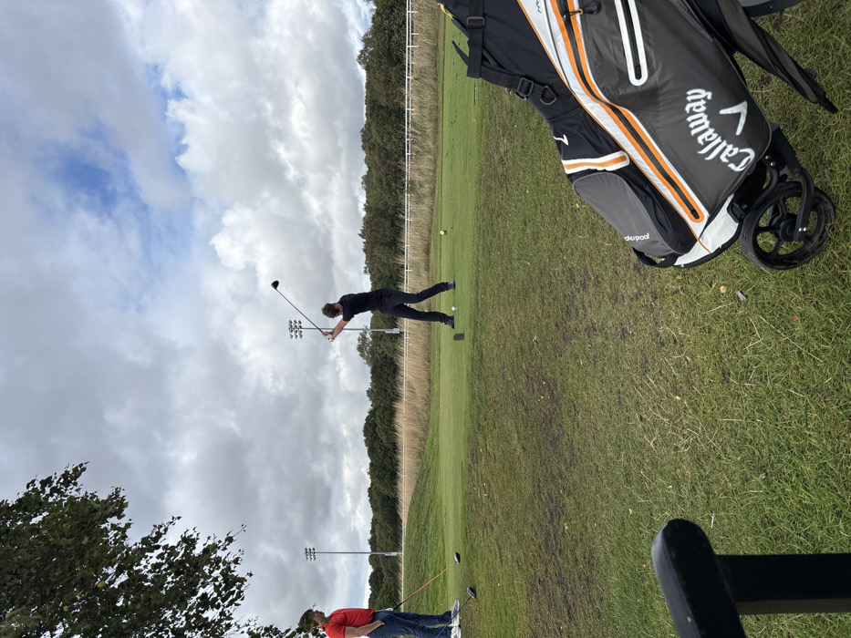 The image displays an outdoor golf setting at Gosforth Park Golf Club, located within the Newcastle Racecourse grounds in Newcastle upon Tyne, United Kingdom. The scene is viewed from a low perspective, with a dark, structural element partially obstructing the lower-left foreground. Two adult males are visible on a green turf teeing area. In the center-right, a male wearing a black t-shirt and dark trousers is actively swinging a golf driver, with the club head above his right shoulder after striking or immediately prior to striking a white golf ball from a black tee. To his left, a second male, dressed in a red polo shirt, blue jeans, and white athletic shoes, stands holding a golf driver with an orange shaft, observing the first male's action. A black golf tee is visible on the ground near the second male's position. In the lower-right foreground, a grey, black, and orange Callaway HyperDry golf stand bag on a trolley is partially visible. Further down the range, a yellow golf ball rests on the grass. The background features a white multi-rail fence stretching horizontally, behind which is an area of dry, light-colored grass and a dense treeline. Two tall floodlight pylons with multiple lamps are visible in the distant left-center. The sky is partially covered by white and grey clouds, with patches of blue visible.