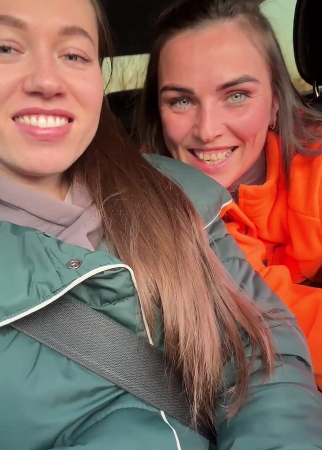 Two smiling women are in a car. The woman in the foreground has brown hair and is wearing a green jacket. She is wearing a seatbelt. The woman in the background has brown hair pulled back in a bun and is wearing an orange jacket. The car is dark.