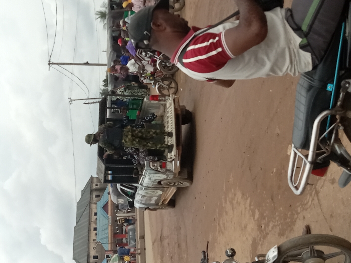 The image displays an active street scene in Ura Nta Umuarandu, Nigeria, under an overcast sky