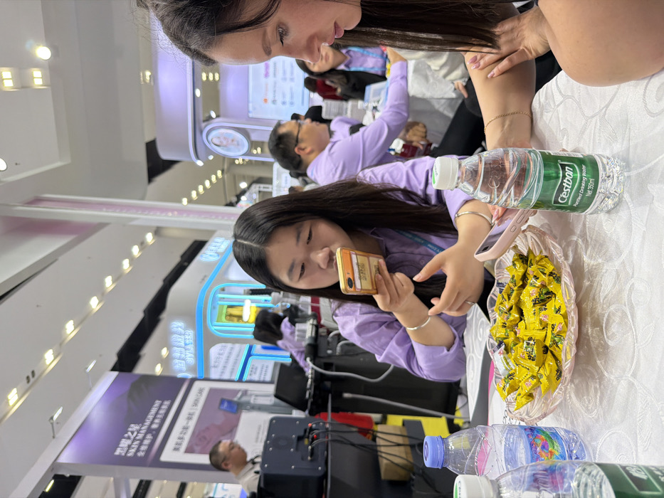 This image depicts an indoor exhibition or trade show scene, consistent with a location in Haizhu District, China. The foreground features a white textured tablecloth upon which rests a clear, fluted glass bowl filled with numerous individually wrapped yellow candies. Several plastic bottles of "Cestbon" Purified Drinking Water (Net 350ml) are also present, one with a green cap and another with a blue cap. Two women are seated at the table in the foreground. The central figure is an East Asian woman with long dark hair, wearing a lavender long-sleeved collared shirt and a light blue lanyard around her neck. She is holding a gold-colored smartphone horizontally near her face, intently focusing on its screen. A silver bracelet is visible on her left wrist. To her right, another woman, visible in profile from the upper chest, also has long dark hair and wears a similar lavender shirt with a light blue lanyard. Her right arm rests on the table as she looks downwards and to her left. In the mid-ground, a man in a white shirt and dark tie is partially visible on the far left, appearing to operate equipment. Further back, several other individuals, including men and women, many wearing lavender shirts and lanyards, are seated at various tables. The background consists of multiple exhibition booths. One booth features white and purple branding with Chinese text and the English phrases "SKIN MANAGEMENT" and "SKIN CARE." Another booth exhibits blue neon lighting with Chinese characters, including "思妍丽" (Siyanli), and potentially "SIVANNI." The ceiling of the venue is equipped with rows of recessed rectangular light fixtures.