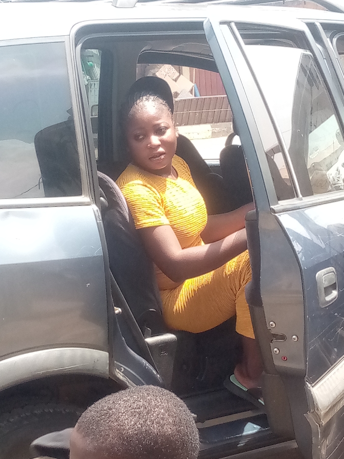 The image depicts a young adult female seated in the front passenger seat of a dark-colored sport utility vehicle (SUV) or minivan, with the passenger door open. The scene is set outdoors in a daylight environment, identified as Kafanchan B, Nigeria. The female subject has dark skin, dark hair pulled back, and is wearing a mustard yellow, ribbed short-sleeved top and matching pants, possibly a jumpsuit. She is looking towards the viewer's left, with a neutral to slightly attentive expression. Her right arm is visible, with her hand resting near her lap, and she wears light-colored flip-flops on her feet. The vehicle is dark grey or blue, showing some superficial scratches on the exterior of the open door. The interior is dark. In the lower-left foreground, the top of a person's head with short, dark, textured hair is visible, partially obscuring the vehicle's left front tire area. The background elements include a light-colored building or wall structure, fragmented views of other structures, and a distinct curb or raised concrete element behind the vehicle, indicating an urban or semi-urban setting. No direct interaction between the visible subjects is discernible beyond their presence in the same frame.