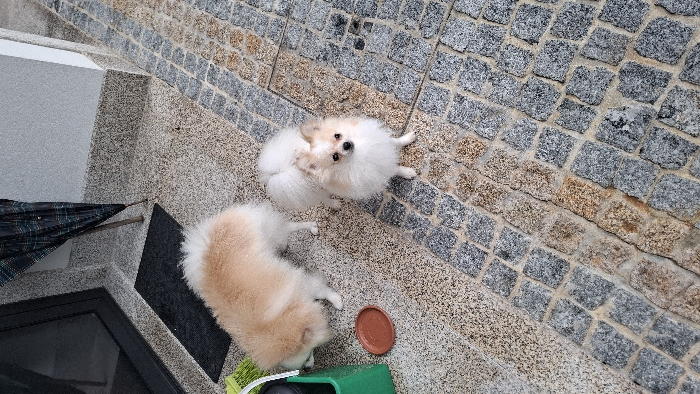 - "The image displays an outdoor paved area, presumably in Barcelos, Portugal, featuring two small, fluffy dogs" by FM-VH5CK2, licensed under CC BY 4.0