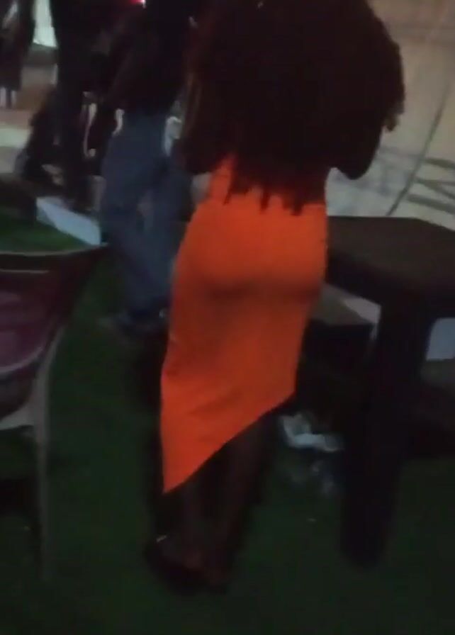 dimly lit outdoor event space at night. A person with long, dark hair is seen from behind, wearing a fitted orange dress. They are walking towards a slightly elevated stage area. Around them are black tables and plastic chairs on a dark green artificial turf. There are a few other people in the background, some standing and some sitting. The stage area has a white backdrop lit with blue and pink lighting. The overall atmosphere seems relaxed and possibly social, with music playing in the background. The camera is somewhat shaky and focuses on the person in the orange dress.