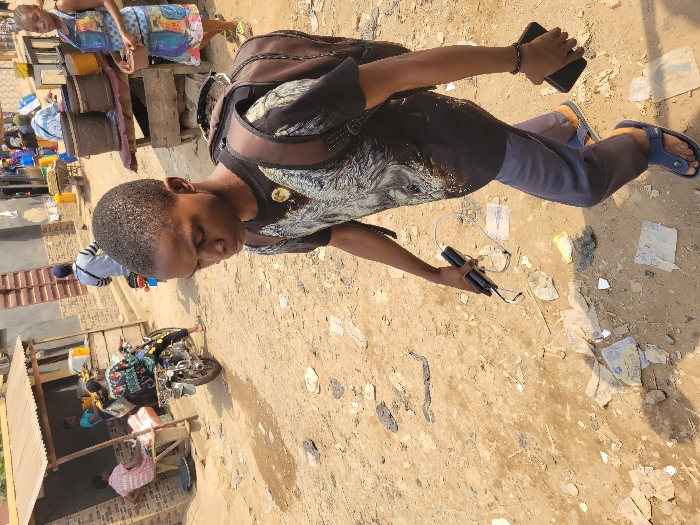 The scene depicts a daytime street environment in Awka, Nigeria. In the foreground, a young individual with short dark hair, wearing a black graphic t-shirt, blue trousers, and blue flip-flops, walks diagonally left with a downward gaze. They carry a brown backpack, a black power bank with an attached white cable in their right hand, and a black smartphone in their left hand. The ground is an unpaved, light-brown dirt surface covered with scattered paper fragments and debris. In the midground on the left, a small vendor stall with a corrugated metal roof houses two individuals; one is seated at a wooden table, and another stands near produce. A person seated on a silver motorcycle, wearing a multi-colored patterned jacket, is positioned facing away from the camera. To the right, a woman in a colorful patterned dress stands near a wooden display table holding several brown receptacles, with a small brown object in her hand. Another individual in a striped shirt and cap is partially visible near a second motorcycle further in the background. The background features simple, unpainted buildings and additional indistinct human figures, indicating a busy urban area.