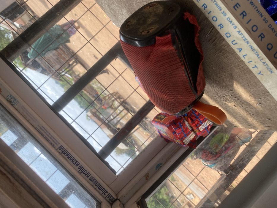 The scene is viewed from inside a structure in Okura, Nigeria, looking out through a barred window. In the immediate foreground, a damaged red portable speaker with an orange rubber loop lies on a weathered wooden surface. Its fabric covering is torn, exposing internal components or missing casing sections, and the base is a dark, possibly metallic, material. Beside it, a stack of items wrapped in red foil, possibly biscuits or snacks, rests near the window frame. The window consists of multiple panes framed by white aluminum profiles bearing text, including "global aluminium profile exoonential" and "YOUNG ALLUMINIUM [sic] NIGERIA LTD" along the upper frame. The glass panes are grimy and feature a grid of dark metal bars. Beyond the window, an unpaved, reddish-brown dirt ground extends into the midground. Several rudimentary, possibly wooden, structures with simple roofs are visible, suggesting stalls or small dwellings. A person wearing a green head covering and patterned clothing walks away from the viewer towards the right side of the frame. Another person is partially visible further left in the midground, near other structures. Distant vegetation, including trees and bushes, and an overcast sky complete the background. A faint reflection of colorful fabric is visible in the lower left window pane.