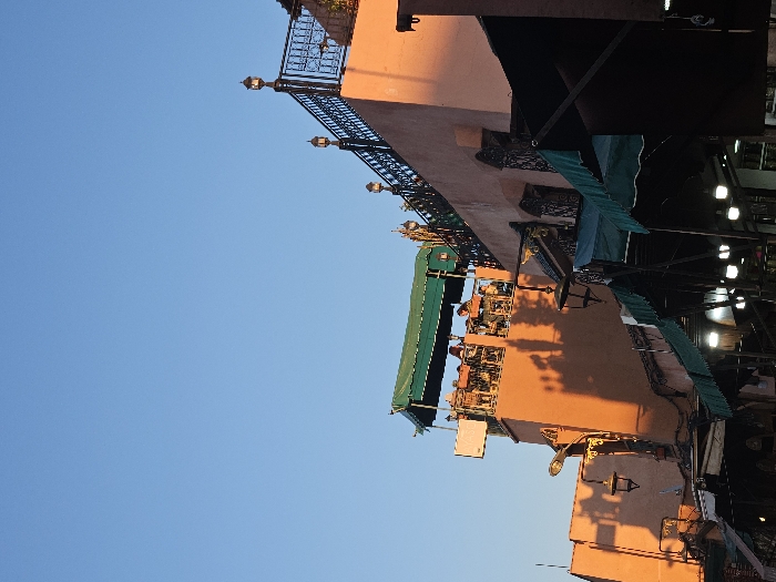An upward-angled shot captures a building with pink walls under a clear blue sky. A wrought iron balcony is visible at the top. Green awnings extend over the lower levels. Shadows from trees or other buildings cast patterns on the walls. People appear to be dining on a rooftop terrace, adding to the scene's vibrant and lively atmosphere. Ornate light fixtures adorn the building's facade.