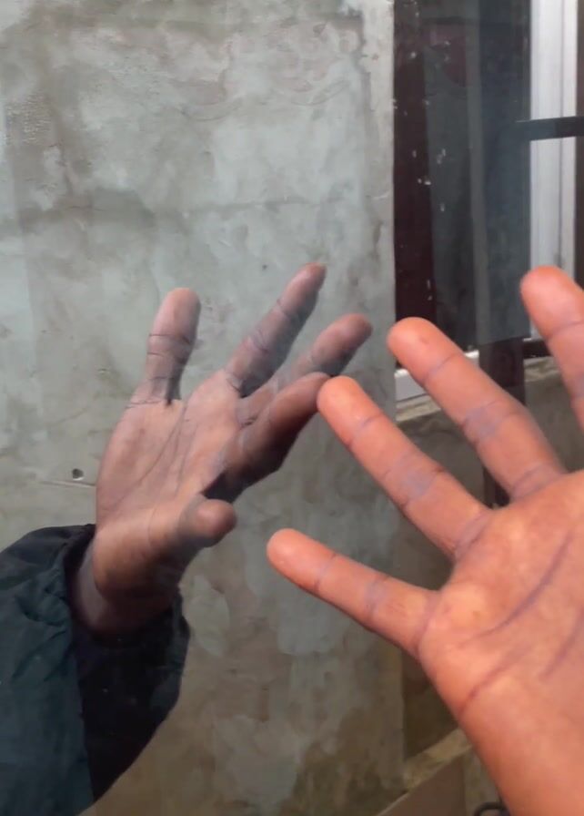 A hand reaches toward a window pane, with its reflection visible in the glass. The hand is darkly pigmented, and the reflection mirrors its position, palm outward, fingers spread. The background behind the glass shows a textured wall with muted, faded patterns. As the video progresses, the hand and its reflection move to form the shape of a heart against the glass. The sleeve of a dark jacket is visible at the edge of the screen.