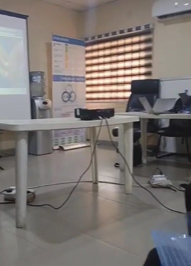 scene inside what appears to be an office or meeting room. Initially, a man is standing in front of a projector screen, holding a camera and seemingly taking a photo of the projected image. The camera is black, and he's wearing a white shirt and blue jeans. Behind him is a projector screen displaying an image and a poster on the wall. There's also a water cooler and a white plastic table with a projector on it. The camera pans to the right, revealing a group of people seated in chairs, facing a man standing in front of them. The standing man is wearing a white long-sleeve shirt and holding a black jacket. Laptops and papers are visible on a table in front of him. The people seated in the chairs appear to be listening to the man speaking. The environment is a simple, functional office space with an air conditioning unit visible on the wall. There are also blinds on the window. There are wires from various electronics strewn across the floor.