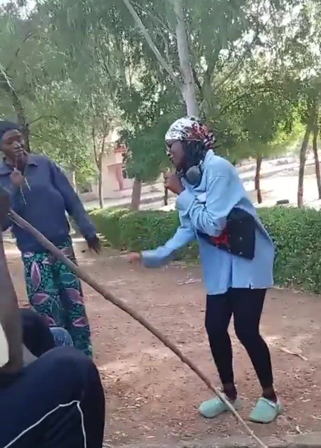 In a park-like setting, a woman in a light blue shirt, black leggings, and light green shoes dances and gestures energetically while holding a microphone to her mouth. She also wears a patterned headscarf and headphones, and has a black bag strapped across her chest. Another woman, wearing a grey jacket and patterned skirt, stands nearby laughing. A person's arm extends a wooden stick towards the woman in blue, while other individuals are seated nearby, partially visible. The background features trees, a building, and a grassy area.