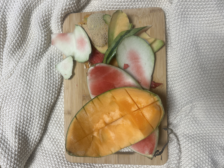The scene depicts a rectangular wooden cutting board, approximately 30-40 cm in length, positioned diagonally on a light-colored, possibly cream or off-white, knitted textile surface. The cutting board contains remnants of consumed fruit. Prominently featured on the left is a large, segmented half of an orange-fleshed cantaloupe (rockmelon), cut into cubes but still attached to its light green/orange rind. To the right of the cantaloupe are various pieces of watermelon rind, predominantly white with remnants of pink flesh and some green outer rind, interspersed with several dark watermelon seeds and small red fragments of watermelon flesh. Also present are pieces of pale tan/orange cantaloupe rind, exhibiting its characteristic netted pattern. The items are scattered across the board, indicating recent fruit consumption. This scene is located in Corrimal, Australia. No individuals are present, and no active interactions are occurring. The environment suggests an indoor setting.