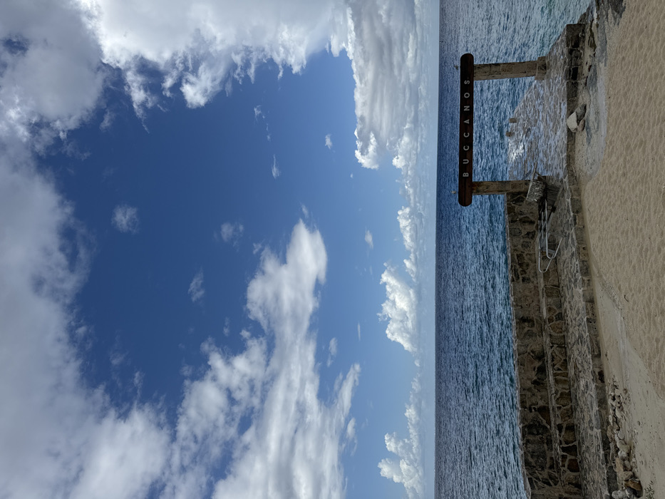 The image depicts a coastal scene in Cozumel, Mexico, specifically at Buccanos Beach Club and Grill, indicated by a prominent sign. The sky occupies the upper two-thirds of the frame, showing a clear blue expanse with scattered white cumulus clouds. Below the horizon, a deep blue ocean with visible surface ripples extends across the middle ground. In the foreground, from bottom-left to bottom-right, a light-colored sandy area transitions into a stone-built structure. This structure consists of a multi-tiered stone wall on the left, leading to a flat stone pier or jetty extending into the ocean on the right. At the entrance to this pier, a rustic wooden sign stands, supported by two vertical posts, bearing the word "BUCCANOS" in light-colored letters on a dark wood plank. A metallic, triangular-shaped object, possibly a ladder section, lies on its side on the stone steps to the left of the pier. The scene is devoid of people or active interactions.