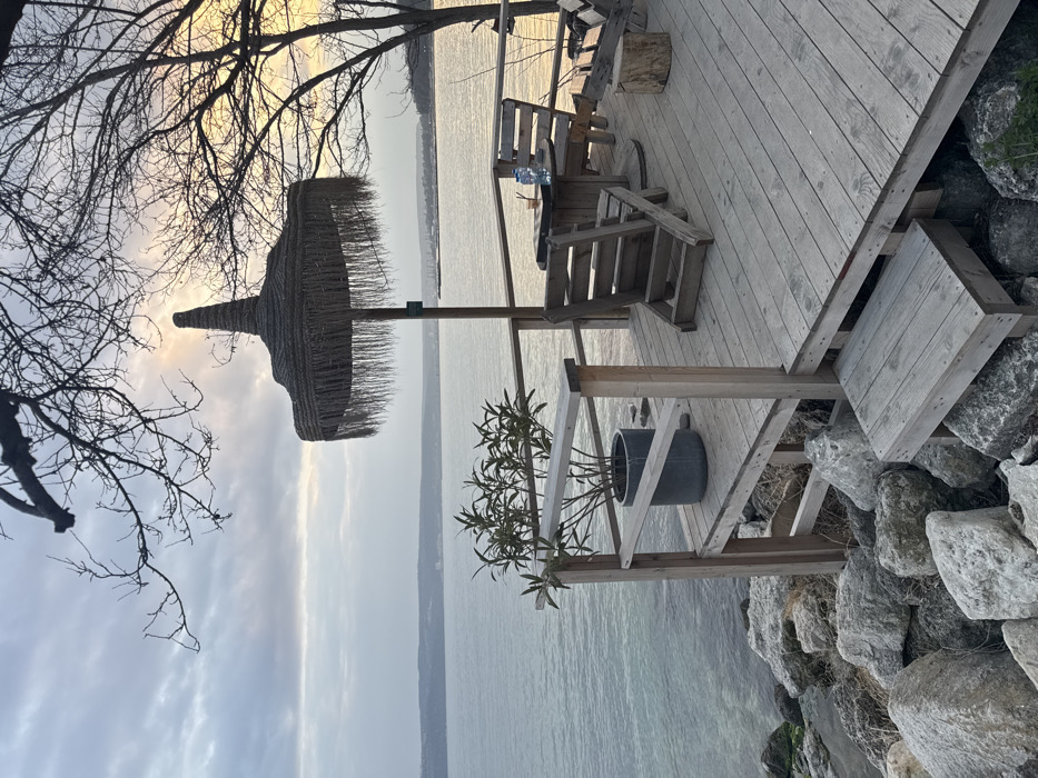 The image presents an outdoor wooden deck establishment situated on a rocky coastline adjacent to a large body of water, identified as the coastal area of Varna, Bulgaria, overlooking the Black Sea or Varna Lake. Distant shorelines and what appears to be port or urban infrastructure are visible across the water. The sky is largely overcast, displaying a gradient of warm, soft light on the right horizon, indicative of either sunrise or sunset. The deck features a light-colored wooden plank surface and a simple wooden railing. A prominent, tall umbrella with a conical, thatched canopy and a fringed edge stands on the deck. Beneath the umbrella, a small, round, dark wooden table is positioned between two slatted wooden chairs. A clear plastic water bottle and an additional dark object rest on the table. To the right, a low-slung wooden chair or lounge chair is present, along with a cut wooden log serving as a stool or side table. On the left side of the deck, a dark grey cylindrical planter holds a multi-stemmed plant with numerous green leaves. The immediate foreground reveals a jumble of large, light-colored boulders and smaller rocks at the water's edge, partially covered in dry vegetation. A single wooden step leads down from the deck onto these rocks. Bare tree branches without foliage partially frame the upper left and right portions of the image. No individuals are present in the scene, and no specific actions or interactions are depicted.