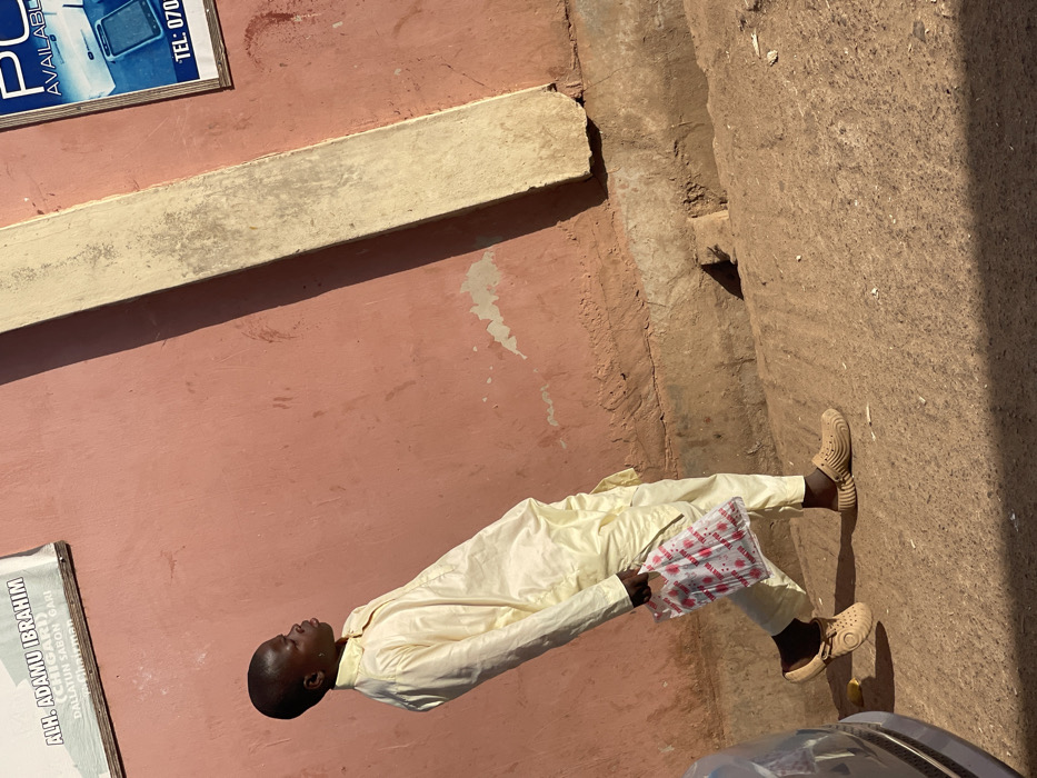 The image portrays an outdoor street scene in Samaru, Nigeria. A young male subject, dark-skinned with short hair, is captured in motion, walking from the left to the right side of the frame on an unpaved, reddish-brown dirt surface. He is attired in a light yellow, long-sleeved collared tunic and matching trousers, and wears light brown Crocs-style slip-on shoes. In his left hand, he carries a transparent plastic bag containing red and white items, marked with a repeating red text pattern. His head is turned to the right and slightly upward. The background features a reddish-orange building wall, exhibiting areas of wear and peeling paint, under bright, direct sunlight that casts distinct shadows. Affixed to the upper left portion of this wall is a white sign with black text, reading "ALH. ADAMU IBRAHIM (CHIGARI) DALLATUN SABON GARI Chairman". A partially visible blue sign on the upper right side of the wall advertises "PC AVAILABLE" and includes a telephone number. A vertical, light-colored concrete beam is present on the wall, positioned right of center. A portion of a silver-colored vehicle is visible in the lower-left foreground.