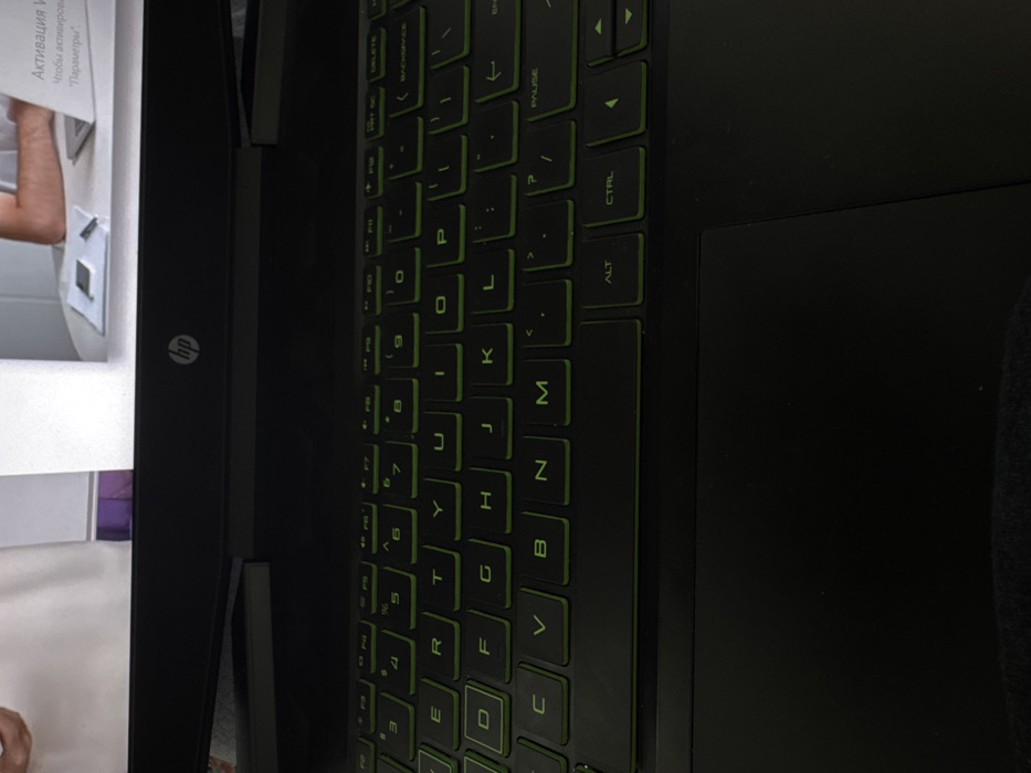 An overhead, close-up shot captures a partially open HP laptop. The black keyboard features keys with green lettering, while the screen displays a partial view of a white surface with text "Активация" and "Параметры". The HP logo is visible on the laptop's side, and a touchpad sits adjacent to the keyboard. The backdrop is indistinct, but seems to be a white surface.