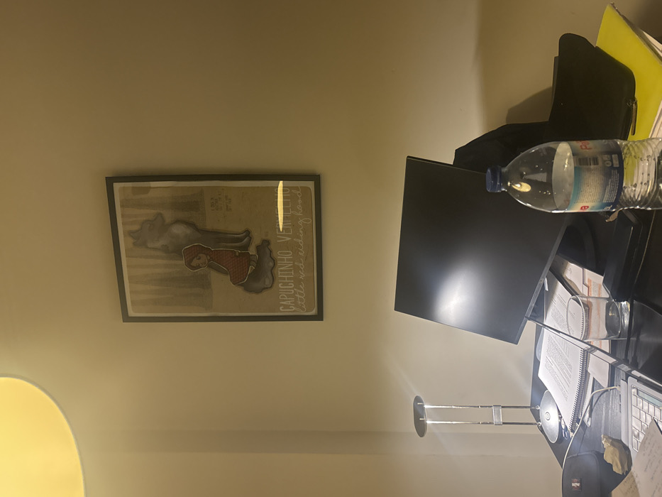 A framed picture of Little Red Riding Hood and the wolf hangs on a beige wall. Below the picture, a computer monitor sits on a desk. A lamp base is visible in front of the monitor. A half-empty water bottle rests on the desk, along with papers, a keyboard, and a yellow folder. The scene is illuminated by warm lighting, likely from a lamp or overhead fixture.