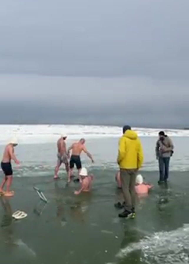 The scene captures a group of individuals engaging in what appears to be an ice bath or winter swimming event