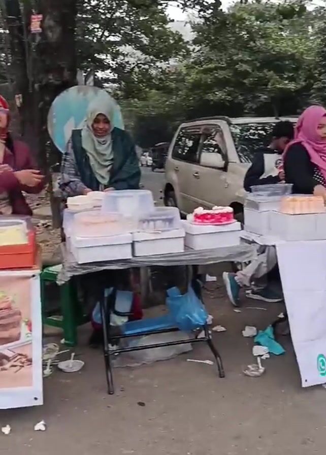 two cake stalls set up on a street next to a row of parked cars. The stalls are run by women wearing hijabs, and they are selling cakes in white boxes. One stall has a banner that says "Sweet & More" along with a phone number. The other stall has a banner that says "Maanha's Mom Kitchen" with a description about an authentic family recipe, a Facebook logo, and a phone number. People are walking past the stalls and a man is carrying a plastic bag away from one of the stalls. The background shows trees and buildings.